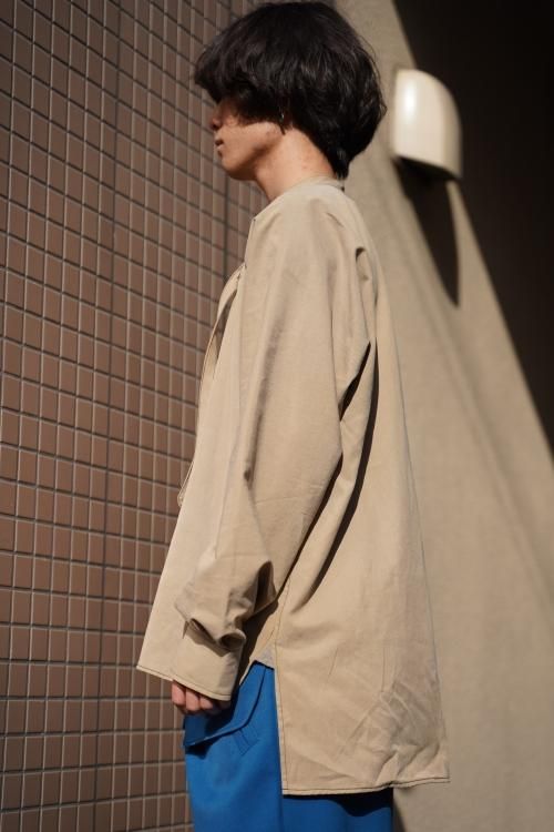 -バンドトップシャツ- アシンメトリーな襟ぐりは長いベルト仕様となっており、そのベルトを活かして様々な着こなしが楽しめる。片側のアームホールを無くすことにより自然なドレープ感を演出。全体的に適度にオーバーなサイズ感を出した。袖口はカフス仕様。袖とスリット部分はマチ付き。インドネシア産の月のように見える高級シェルボタンが付く。シーズンを問わず活躍できる一着。