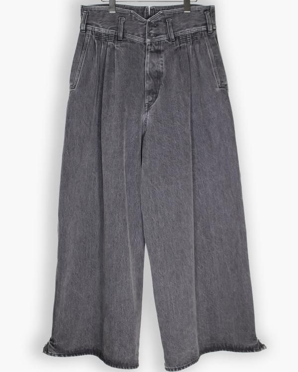 90年代ゴシックウェアのトラウザーから着想を得たバギーシルエットデニムパンツ。サブカルチャーの要素を多く感じるthe90'sのストーンバイオ加工バギーデニム。後ろ裾はわざと引きずって破けたようなデザインとなっている。良品の証であるギャランティーネームを使用。