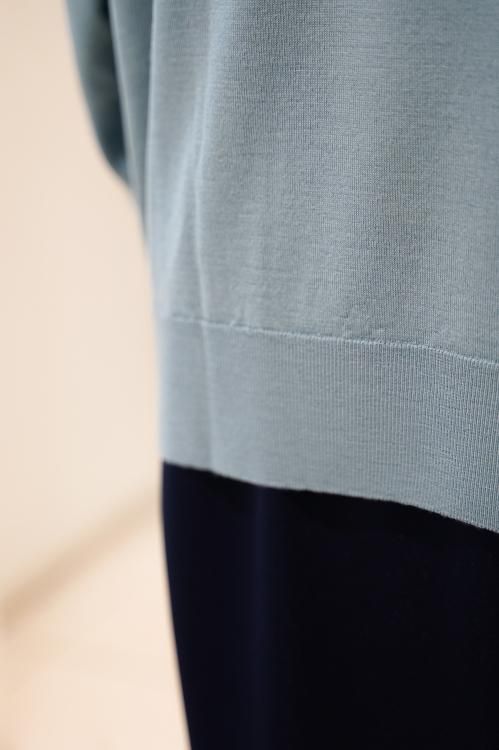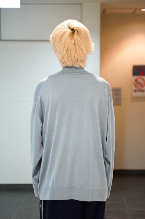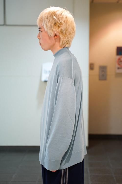 素材はブランド定番のニュージーランド・メリノウールの30ゲージ。型はオーバーサイズのモックネックで、編み機の最大限まで身幅を広げていただきました。正真正銘の過去最大のJOHN SMEDLEYです。首元に、詩集を意味する”ANTHOL”の文字刺繍ワッペンを貼り付けています。