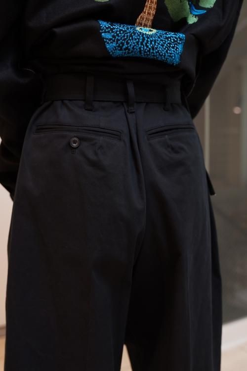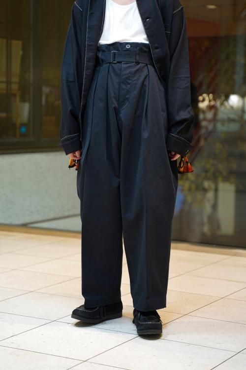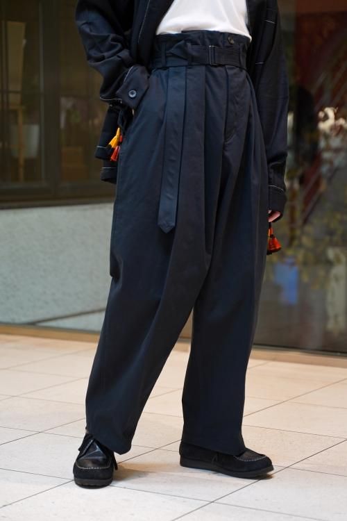 日本古来の袴からインスパイア。「渡来、土着」をイメージにデザイン。生地はVardhman社のコットンチノ、繊細なピーチ感とハリ感、綺麗な表情のツイルが特徴。フロント右側にタックを寄せてドレープを生み出し、ウエストでベルトを絞って着用する事で様々なシーン、オールシーズンで活躍するESSAY定番のパンツ。