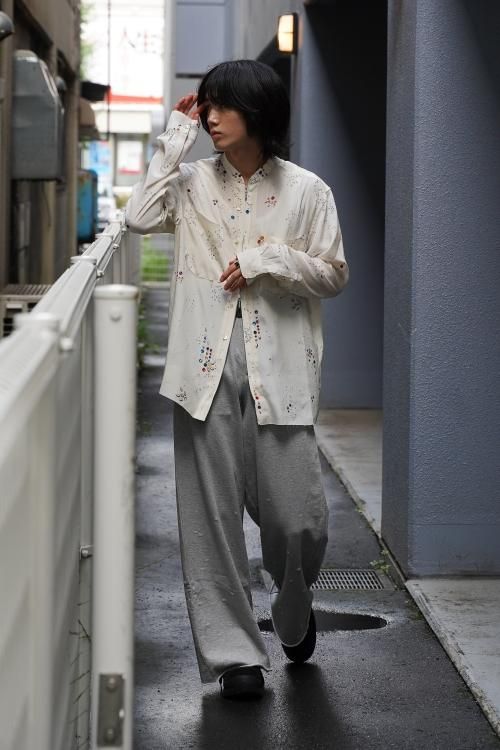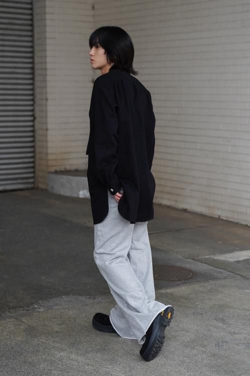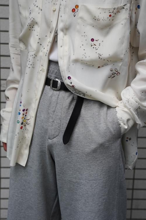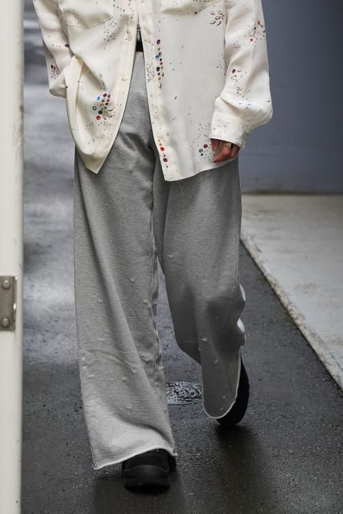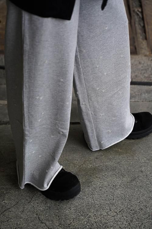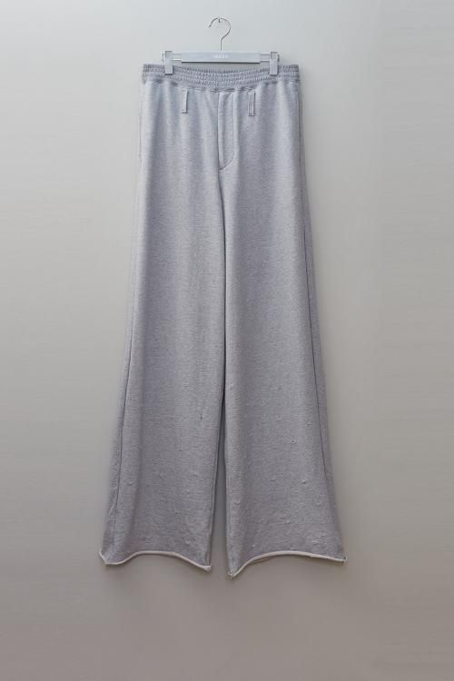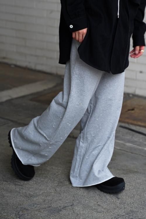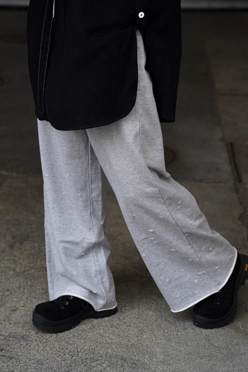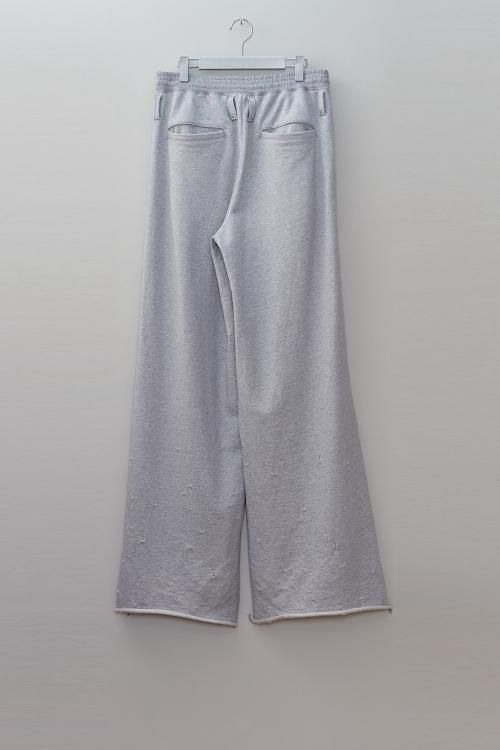 ワイドシルエットのスウェットパンツ。ソフトな裏毛素材を使用。裾から膝にかけてレーザーによる加工が施された。ウェストにはベルトループが縫い付けられており、ベルトによってスタイルに幅を持たせることが可能。また、ウェスト内側のスピンドルでのサイズ調整も可能。