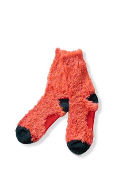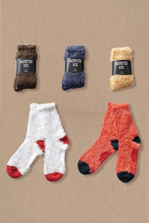 定番モンスターソックス。制作あたり思いついたアイディアはテディーベアのあんよ。あとは、アイテム名を考えてた際に全WBA.WBC.IBF.WBO.世界バンタム級王者井上尚弥のニックネーム。裏毛を全て表にする事で可愛らしさとボリュームを出した。安心誠実の国産に拘り、履き続けてもストレスは無く、穴も空きにくい。伸縮性があり男女問わず履いていただけるフリーサイズ。全5色展開。
