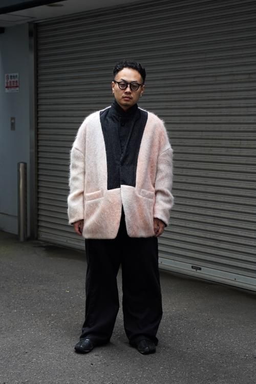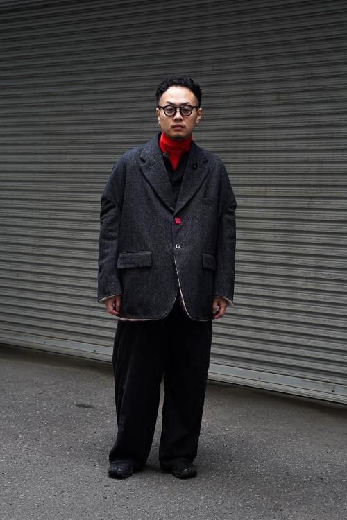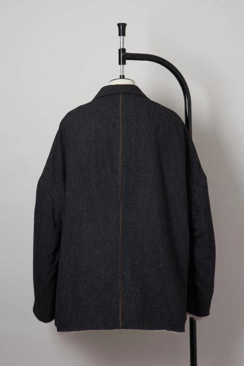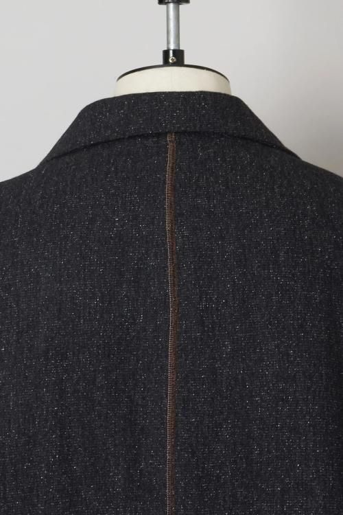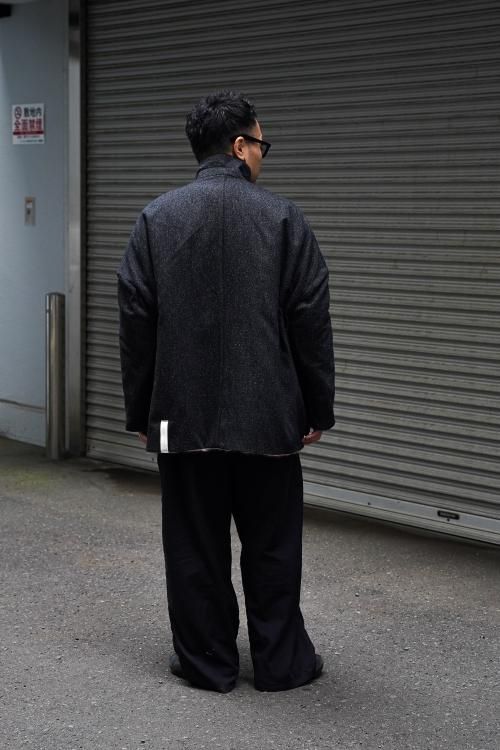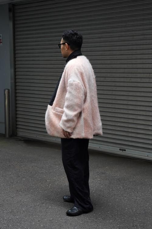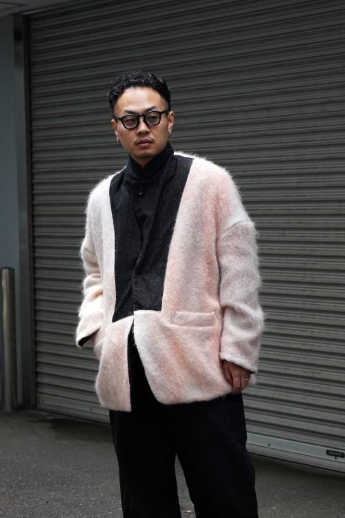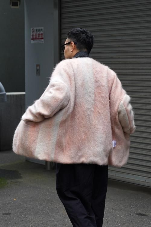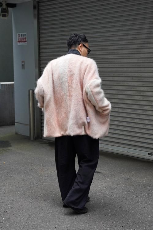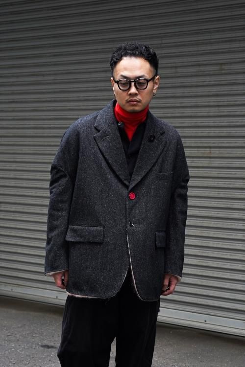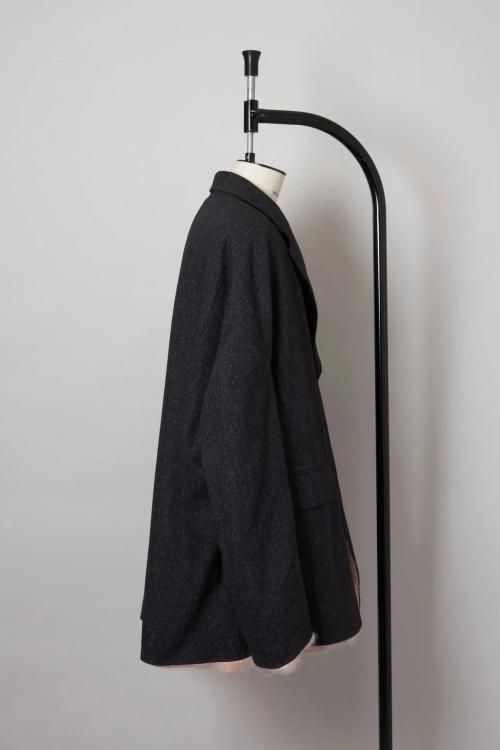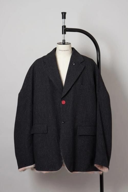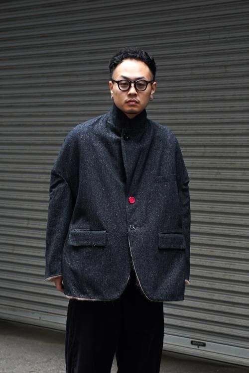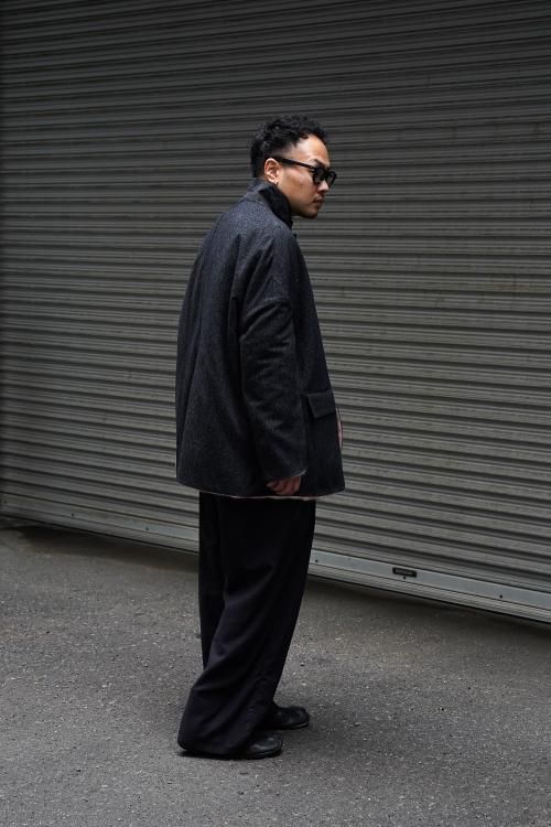 肘のあたりに肩線が来るくらいのドロップショルダーと、二人分くらいの身幅をとった大胆なシルエットのスーパーオーバーサイズラペルドジャケット。リバーシブルで着用可能で、全く違うデザインが楽しめます。表地はオリジナルで製作したネップ感の強入りのウール生地を使用。ヴィンテージのような表情が特徴です。裏地は流し染めのモヘアウールシャギー。 職人の手によって3色の染料を流して染めているので、一点一点染まり方が変わるのが特徴です。