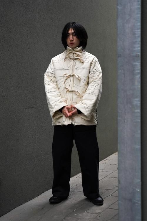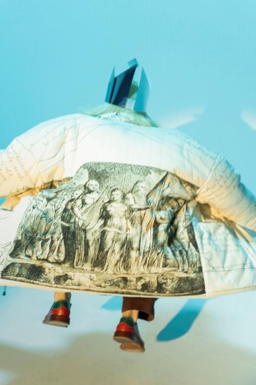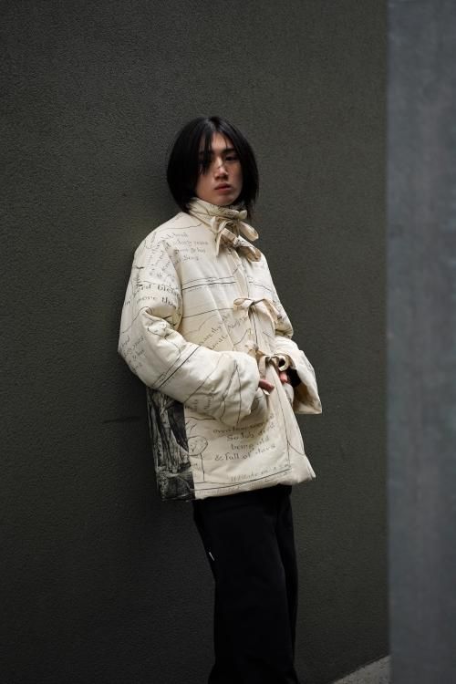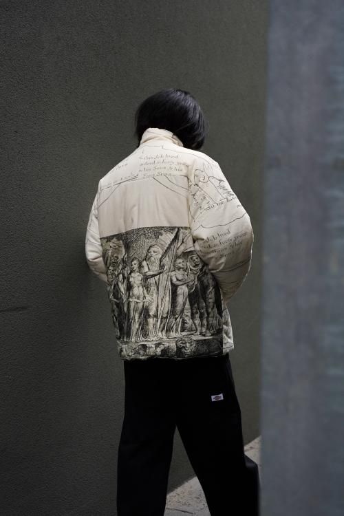 ボリュームと保温性を出す為、中綿160gを挟み込み防寒性を高めながらも軽くしなやかな一着。前立に付いた紐で自由な着こなしが楽しめる男女問わずオススメのアウター。イギリスの詩人で画家、ウィリアムブレイクの宗教画をデジタルプリントで生地全体に表現。