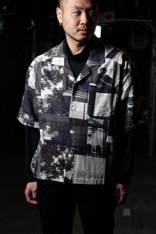 インドのコットンクレープ生地に全面デジタルプリントを施した開衿シャツ。図案は、ビートジェネレーションを代表するアレンギンズバーグが、当時ビートの中心人物を撮った写真を元に、LEHでカットアップコラージュしたビートニク案と、窓の写真で構成したWINDOWS案の2柄展開。ボディーは程良い幅広の身幅と着丈はやや短め設定、オープンカラーの襟は若干大きめに製作。両脇のサイドスラッシュポケットとサイドスリットはボタンで調整可能。胸にはパッチポケット。一部生地の柄を活かし、ラインストーンが取り付けられている。