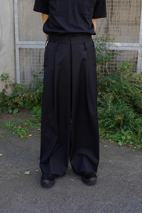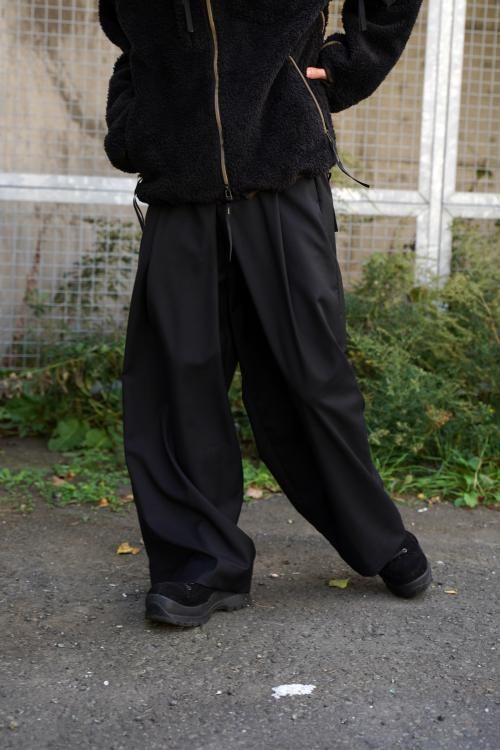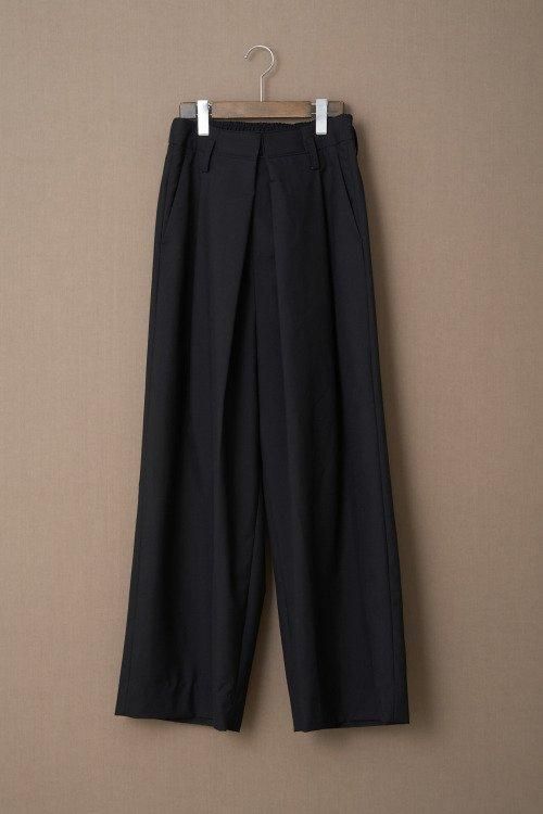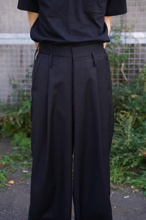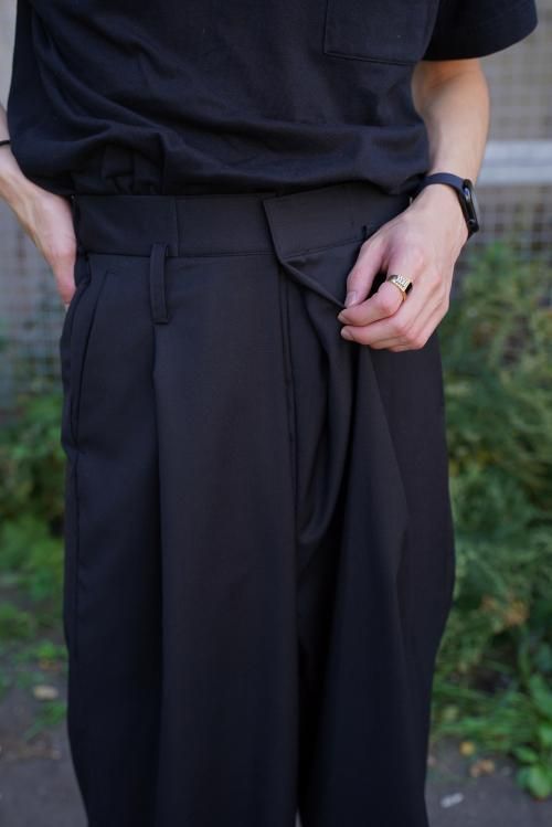 25SSから継続リリースとなるラップパンツ。ウール生地とチノクロスの2種の生地展開。ウエストはマジックテープにより快適に着脱が出来、ウエストの後ろ側のみ平ゴムを入れている為、着用した際のシルエットが綺麗に出る。フロントのタックは外と内を向けることで、より上品な立体感を出している。あらゆる場面で活躍する、今後も定番となるアイテム。