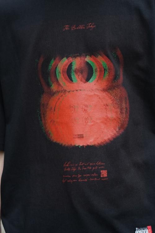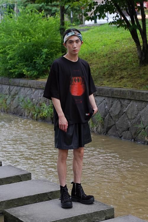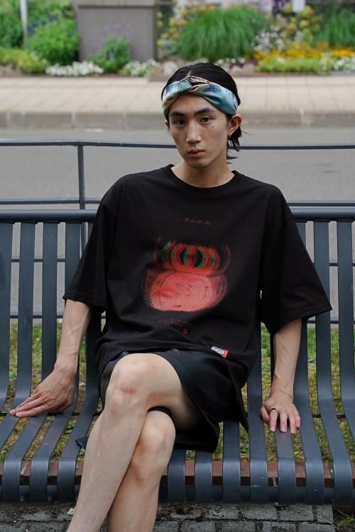 6.2ozの丁度良い目の詰まったオープンエンド糸を使用したふっくらとしたコットン生地。無駄の無いビックシルエット、サイドスリットが特徴。男女問わず着用出来る形で、シルエットを重視。25SS同様、西アフリカの古い仮面をモチーフとしたオリジナルデザイン。今回は仮面を5面にぶらし、2色を敢えてずらしてプリントすることで、より不思議でファンタジックな雰囲気に仕上がっている。