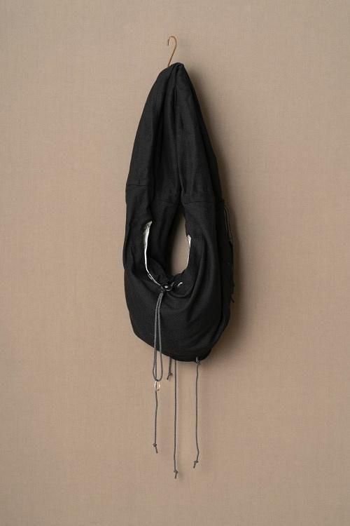 アジア圏の僧侶が身に着ける袈裟がデザインソース。立体的なパターンにより、ドレープ感をさらに加えている。もう1型のKESA Bagのベースはそのままに、底のマチを追加。それを挟むようにいくつかのタブパーツが加わり、菊穴ホール、紐で全体のサイズ調整が可能に。紐出口が多いので、紐が垂れるデザインがバックとしての存在感を引き出している。持ち手部分にはスラッシュコイルファスナーのシークレットポケットがある。