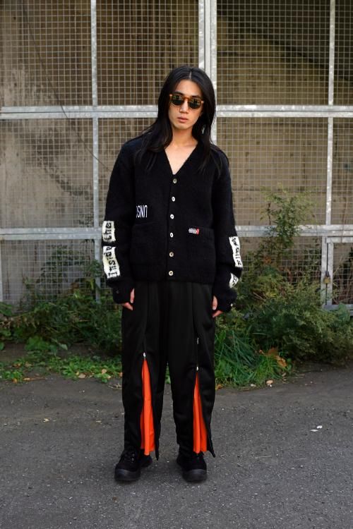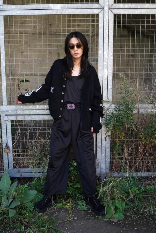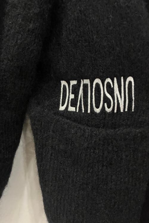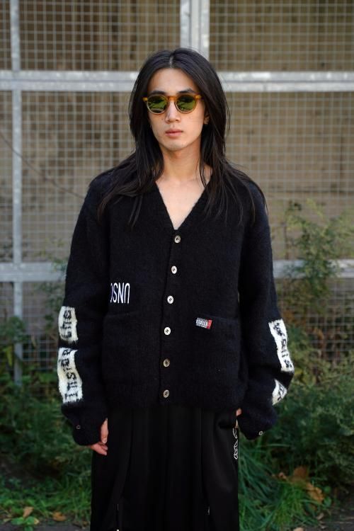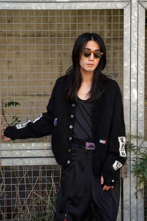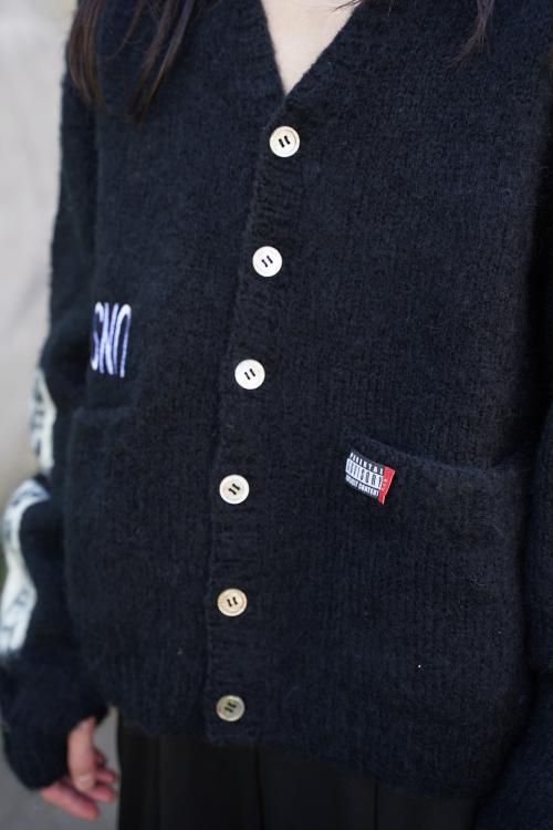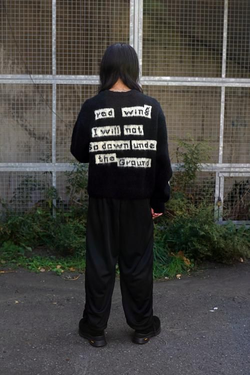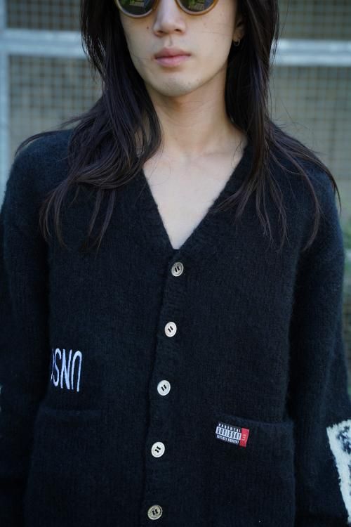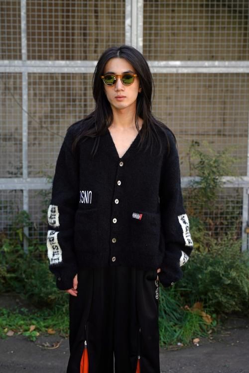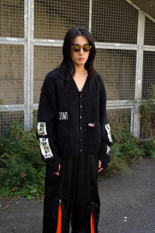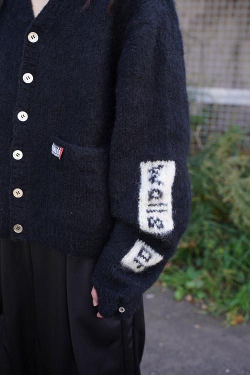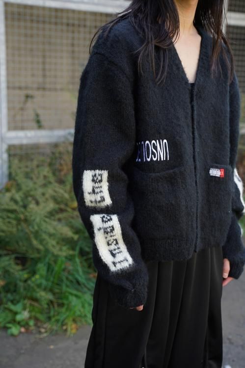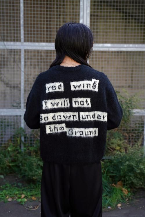 袖丈を長く、着丈を短く設計されたモヘアカーディガン。こちらも袖と背中にはボブディランの歌詞を編んでいるが、モヘアで、しかも手編みで文字を編むことは大変難しく、高い技術力を要する為、価格的に非常にお手頃なアイテム。UNSOLVEDの刺繍を敢えて反転させてフロントに刺繍。迷宮入りの反対の解決の意味を含んでいる。